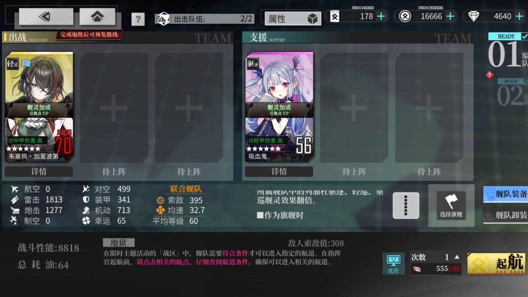 老样子队伍1打满,然后队伍2。这里队伍1中的Z1是捞加里波第的副产物,作为支援船非常强劲,手里的GE晶体直接给Z1等级拉起来。队伍2还是不稳定的话就再加入试用船支援舰。不必太过于追求2队的油耗,毕竟只打boss战,稳定S是最优先的。