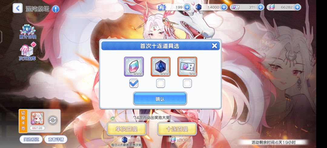 一、混沌池抽卡注意事项,首次抽10连抽选花3000钻石。只能选一次。后面只能用3000空间秘石抽10抽,也可以用。300空间秘石抽1次。