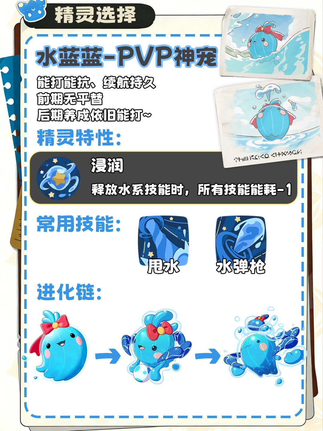 ·水蓝蓝(水系):攻防均衡,技能能耗随战斗递减,续航优秀;后期PVP强势,但前期移速较慢,适合稳扎稳打型玩家。