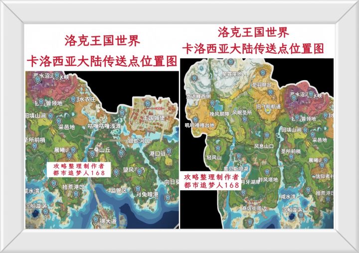 1:图一图二是(洛克王国世界)卡洛西亚大陆地图上下部分传送点位置分布图。
