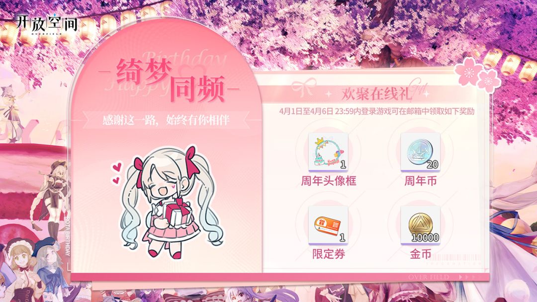 活动期间内登录游戏,可在邮箱中领取:周年头像框、周年币、限定券、金币等奖励。