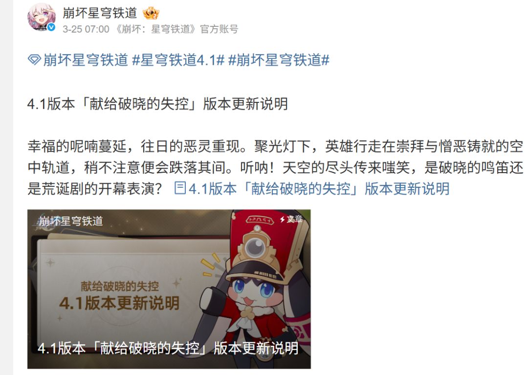 3月25日早6点,星穹列车准时发车。全新4.1版本「献给破晓的失控」正式开启,开拓者们不仅能瞬间领到“老规矩”的600星琼补偿,还将跃迁至全新的“珠星大厦”场景,开启一段充满荒诞剧色彩的「二相乐园」新主线。