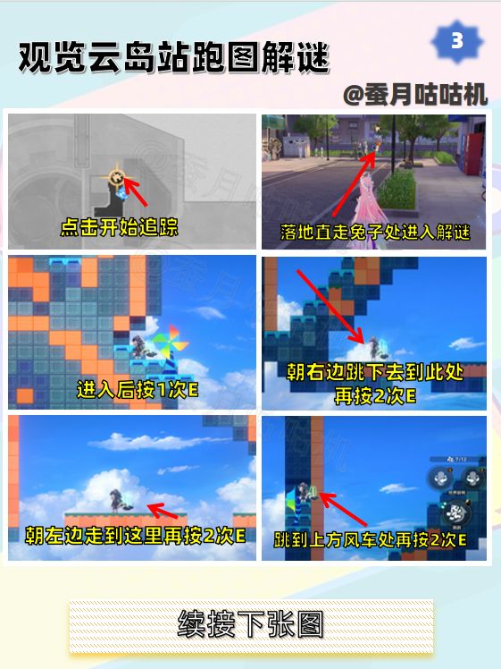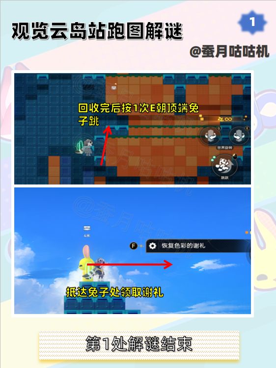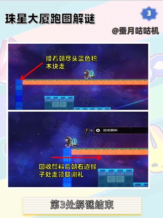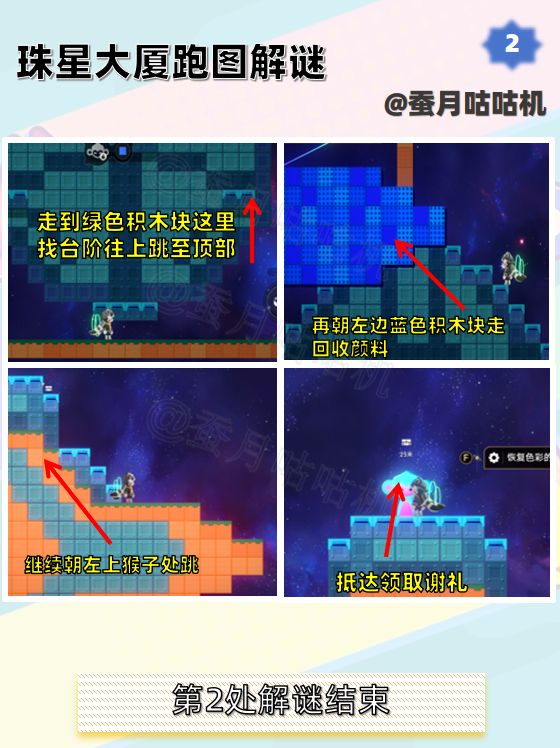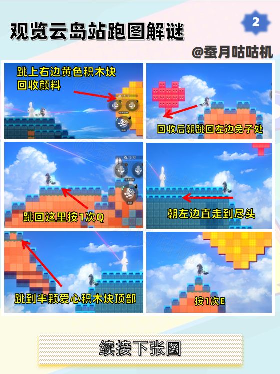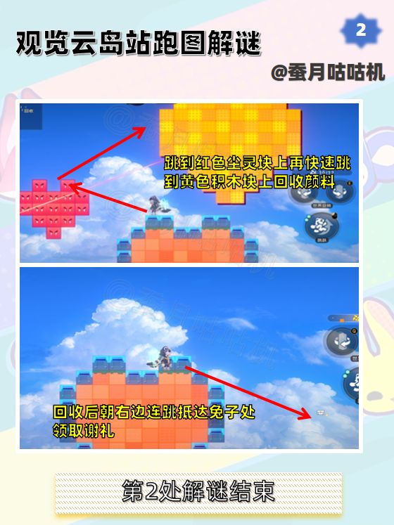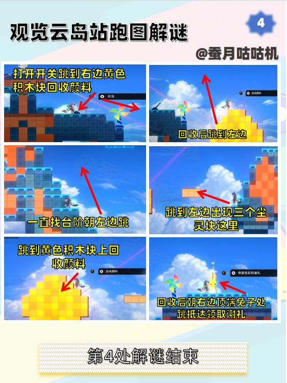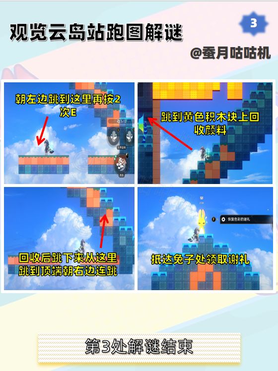 🌱观览云岛站第3处可能会出现最后一处有点不同的情况,但也同样可以跳到黄色积木块回收颜料。