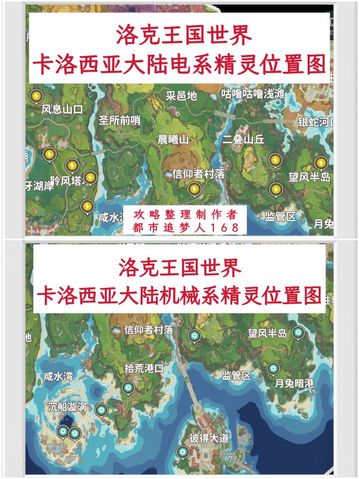 1:图一上图是洛克王国世界卡洛西亚大陆电系精灵位置图。