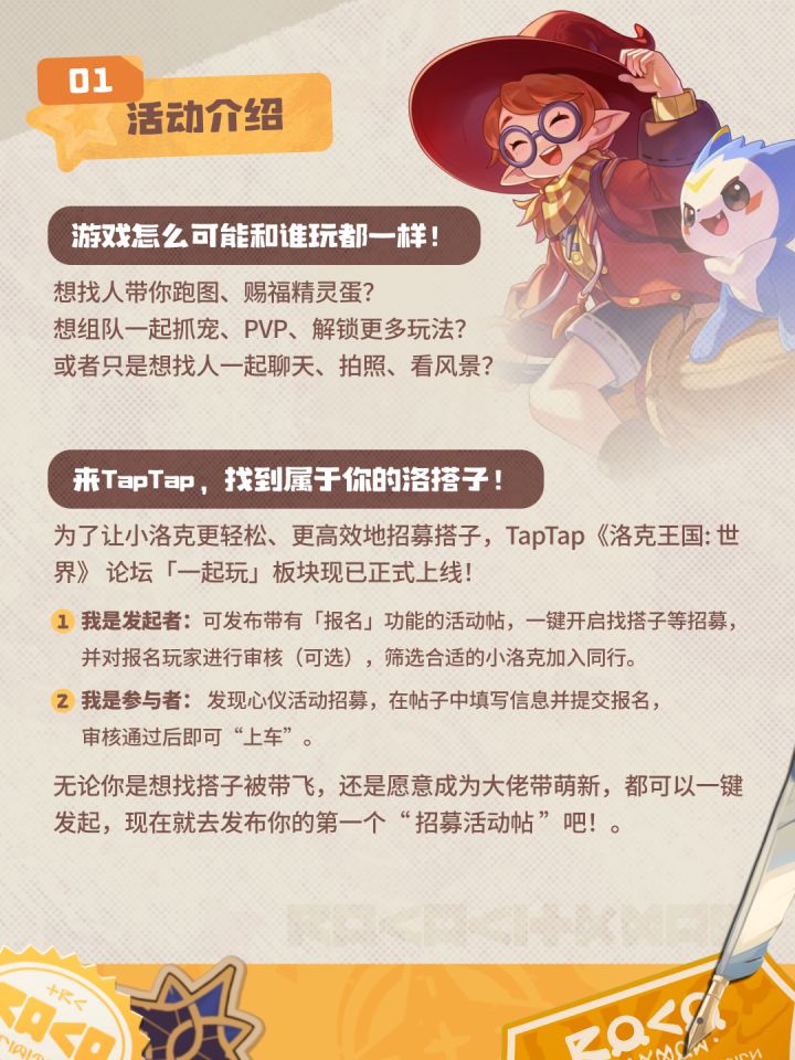 💌亲爱的小洛克:🎀你还记得那些曾与你一起玩洛克王国的童年伙伴吗?或许你仍与儿时的玩伴保持联络,又或许已结识了新的冒险队友?——3月24日,TapTap X《洛克王国:世界》王国结伴计划 正式启动!🙌无论你是一个人,还是想找搭子同行,这里总有属于你的“洛搭子”和一份“你来了真好”的期待~*参与活动无需报名本帖哦,本帖是一个报名招募帖的示例,快来一起发布活动招募洛搭子吧~