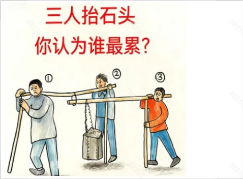 考考你们的物理如何,请问图中这三个人抬石头,你觉得谁最累?