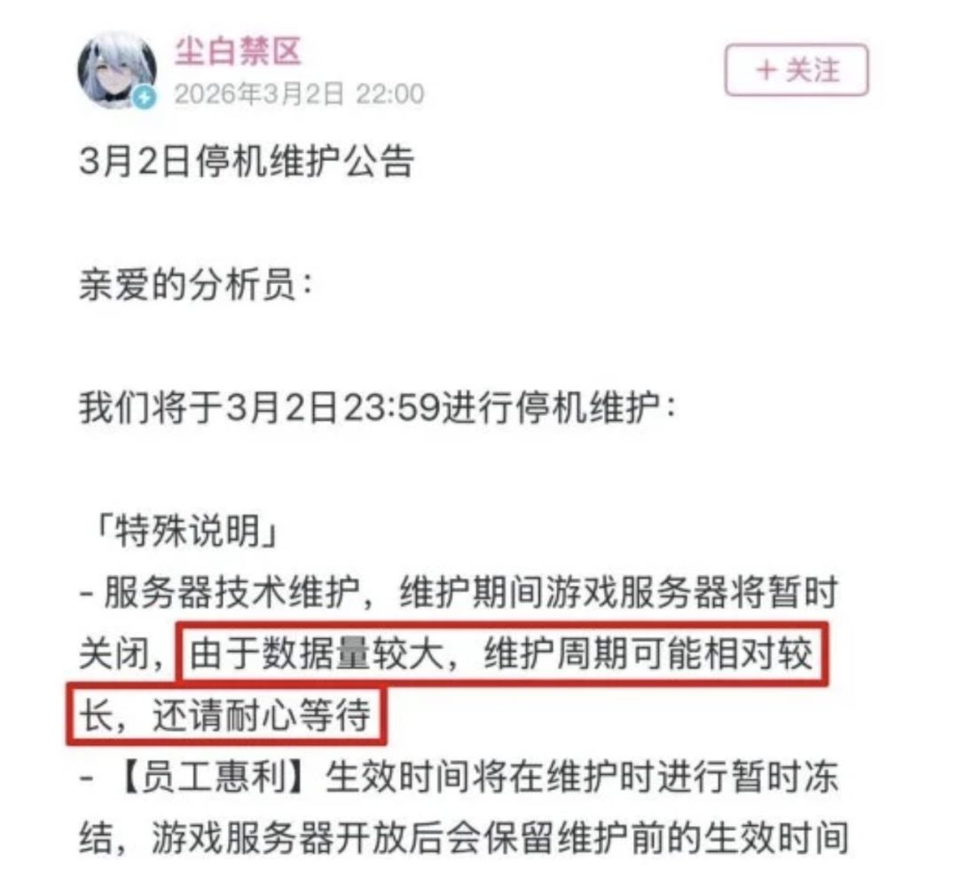 3月2日深夜,《尘白禁区》官方突然发布紧急停服维护公告,宣布于当日23:59关闭全平台服务器,公告仅以“数据处理体量较大,维护周期可能相对较长”模糊说明情况,全程未给出明确的开服时间,随后日服、韩服、台服等全球服务器也同步跟进关停。