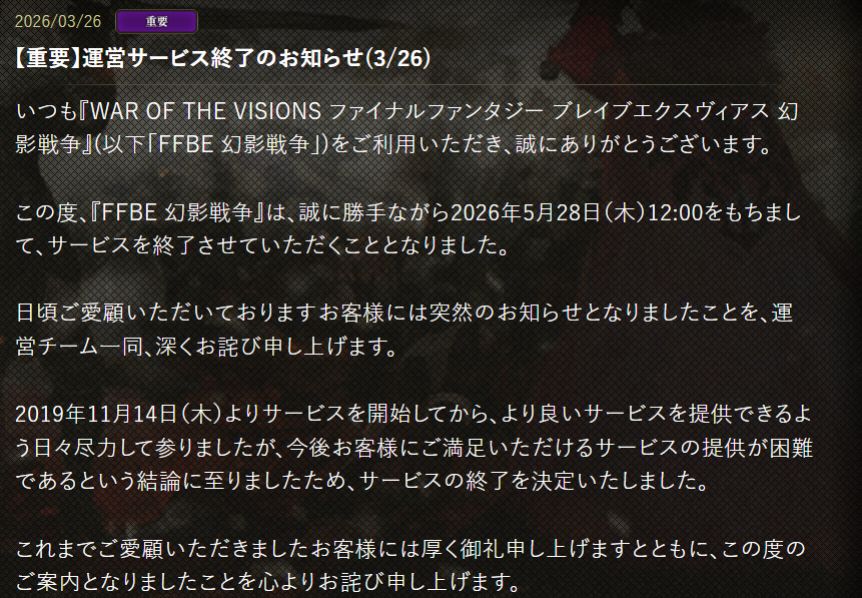 今天,史克威尔艾尼克斯与gumi联合宣布,《最终幻想:勇气启示录幻影战争》日服将于5月28日终止服务,这款手游正式迎来全球关服。该作2019年11月登陆日本移动端,2020年3月全球发行,国际服已于2025年5月提前停运。