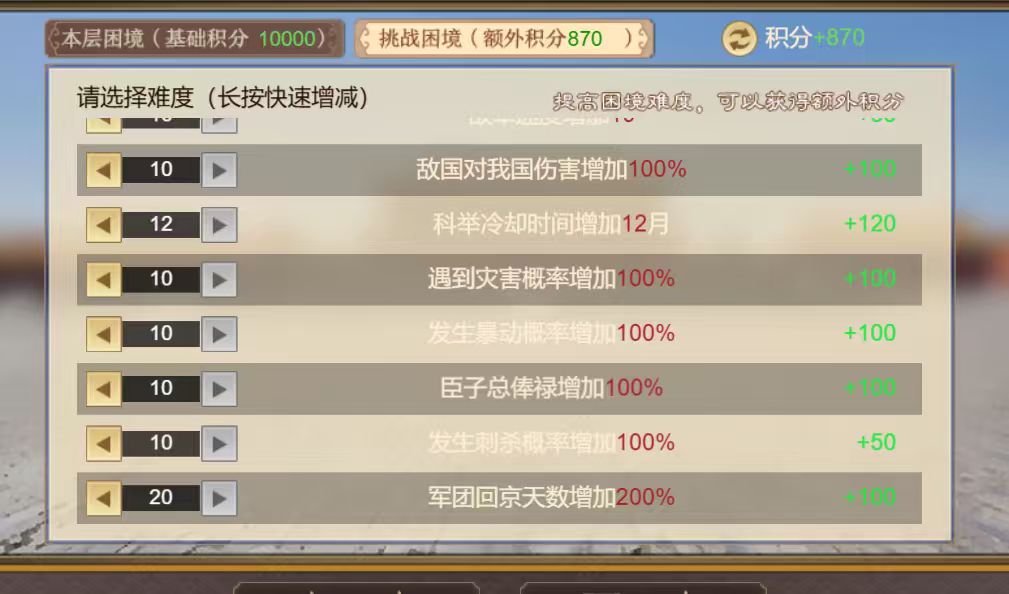 4.开局携带名臣太颠防止刺杀或者召唤典韦,困境难度可全部拉满
