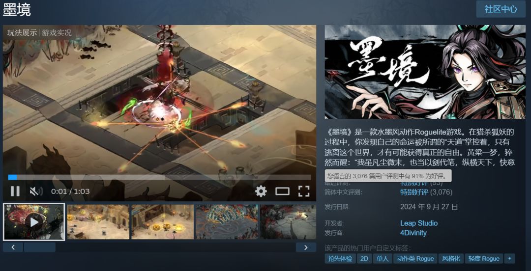 《墨境》是一款以水墨画风作为主要特色的国产Rogue游戏,游戏于24年在Steam平台上面EA发售,截至目前已经收获三千多条玩家评论并且整体保持在91%的好评率上,游戏难度不算高比较适合喜欢肉鸽的萌新入手体验