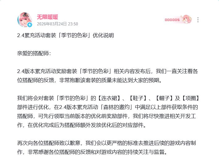 近日官方承认该套装质量未达玩家预期,承诺将在未来对套装内容进行优化,将对连衣裙、鞋子、帽子及项圈等部件进行优化升级
