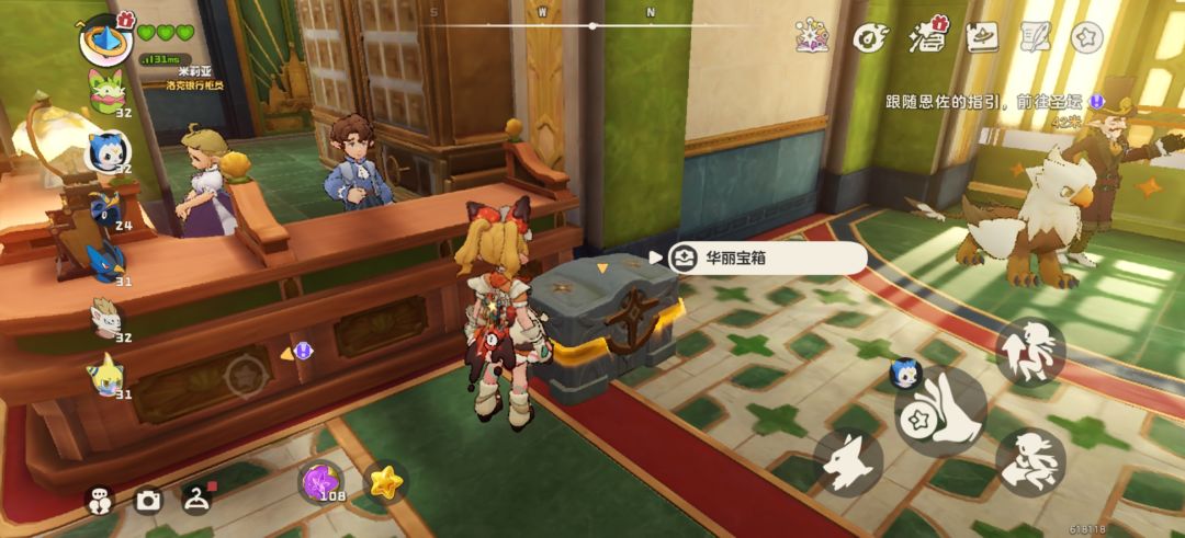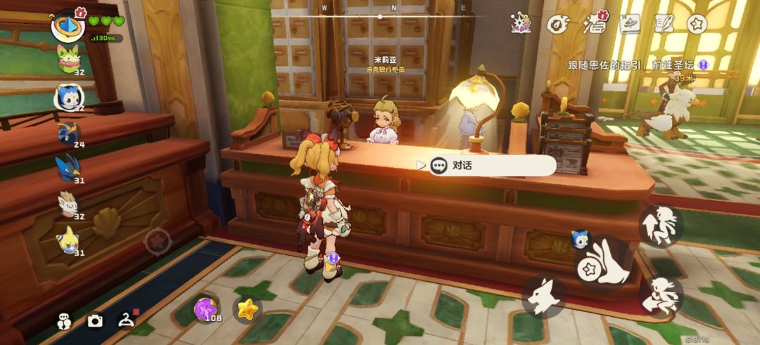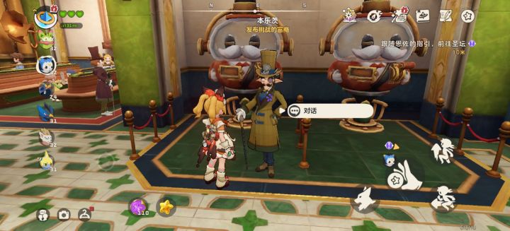 直接找到里面的前台米莉亚互动即可,每个完成后都会给一个华丽宝箱,会有高级球,经验果及国王球碎片,另外别忘了富商身后左手边机器也是有互动奖励的。