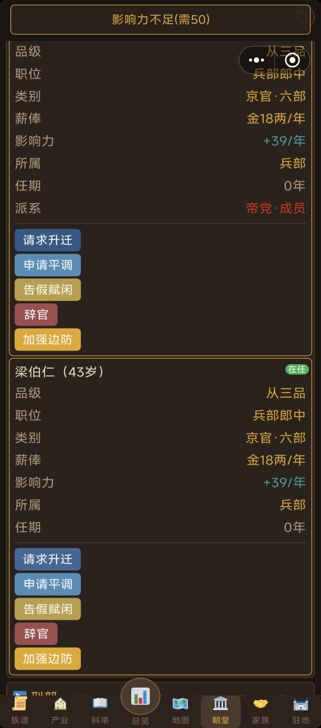 没有办法升官,影响力不会变,当了50多年官影响力一点不加所以没办法升官,不加影响力派系好多玩法都不能使用,不能当武官手上有一堆武状元也进不了武官系里,世家好感度也增加不了,驻地产业也无法建造,最重要是点击不灵敏,好多时候要点好多下才能点得了