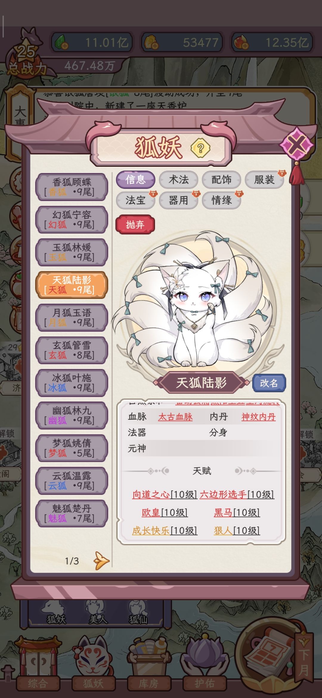 最近根据论坛某Z字开头的大佬提供的信息,我花了一天时间去研究,然后如图所示,做出了一个2⭐开局但是有24只满26天赋狐(示例图每张都有同一只天狐的加成,每月收支汇总是狐妖捐献)的高资源存档。(PS:图是我测试得差不多了才截的,所以有二十多星)如果有想要的的可以先安个眼,我打算这几天抽空传个盘,弄完后再看是发评论还是私信。
