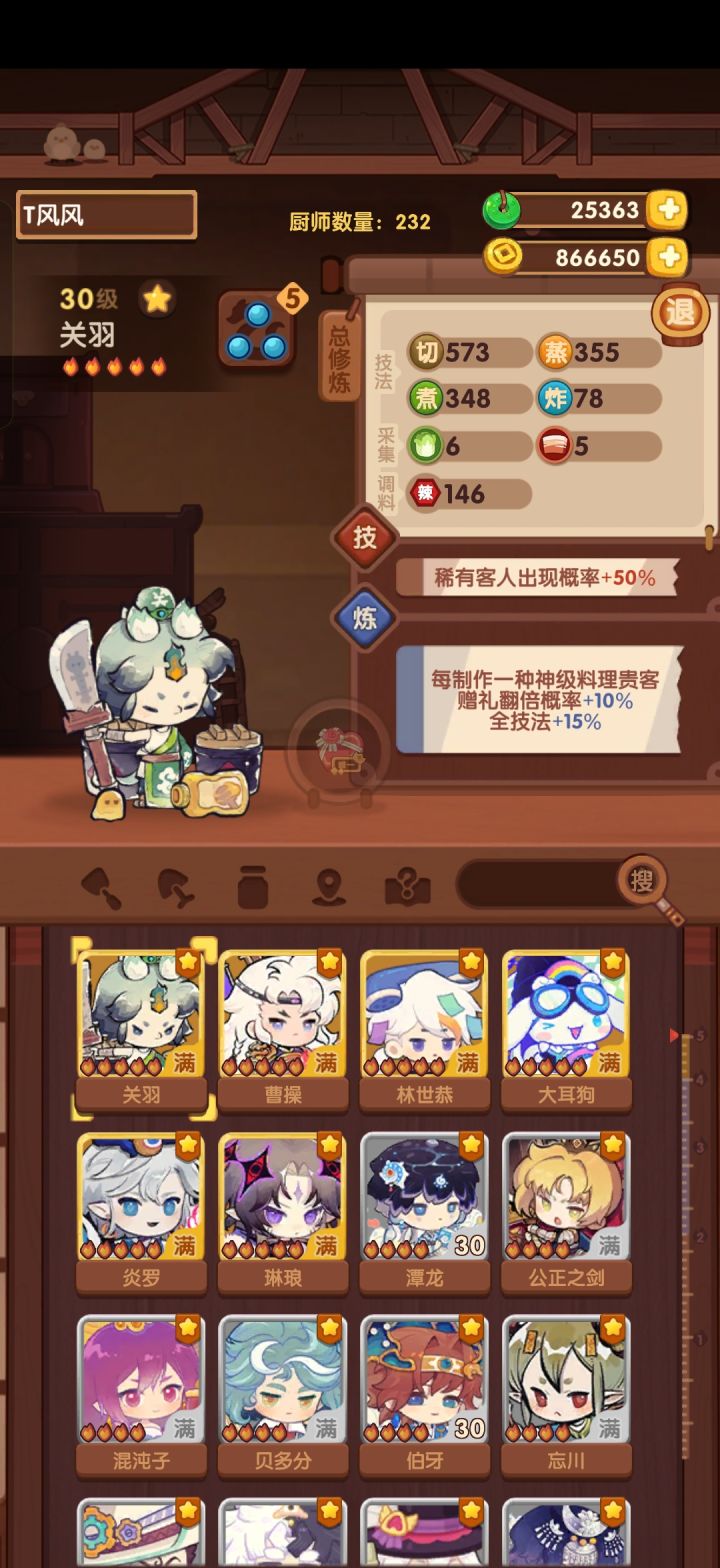 玩了也有一段时间了。这两个都很强。在接下来的坑中,比较想要的就是招财和小王子了。因为有了关羽和曹操,所以那两个池子就不用管了。如果抽残血的话,也能保证招财出的时候有6万。但问题在于我的满朋月只有关羽一套。导致贵客率比较低。如果抽小白。小王子之前应该是拿不到。(按照45000一个池子。)所以特别犹豫。抽小白的好处就是过夜菜刚好拉满。因为有个双贵客菜蒜蓉龙虾也是我唯一一个厨子能做的。