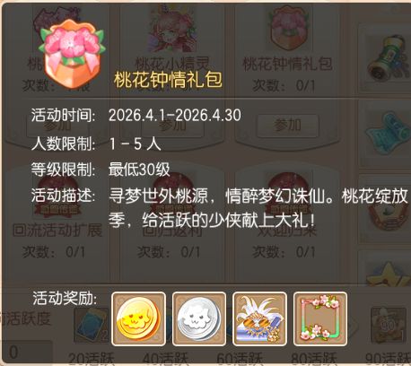 4月1日-4月30日,等级≥30级的少侠,可以单人或组队参与【桃花钟情礼包】活动。在活动开始的第一阶段,少侠们可以通过持续积累每天的活跃值,当活跃值达到要求后,礼包即可升级。