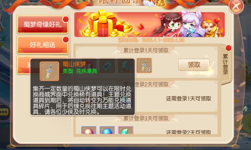 蜀梦奇缘好礼不容错过,2026年4月1日到2026年4月30日期间,每日登录可领取登录奖励,奖励持续20天。