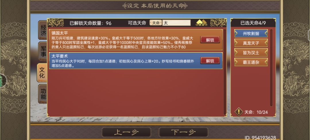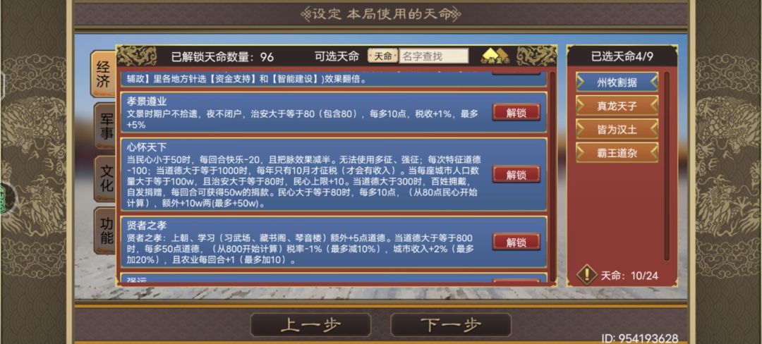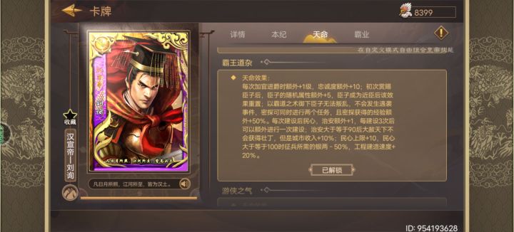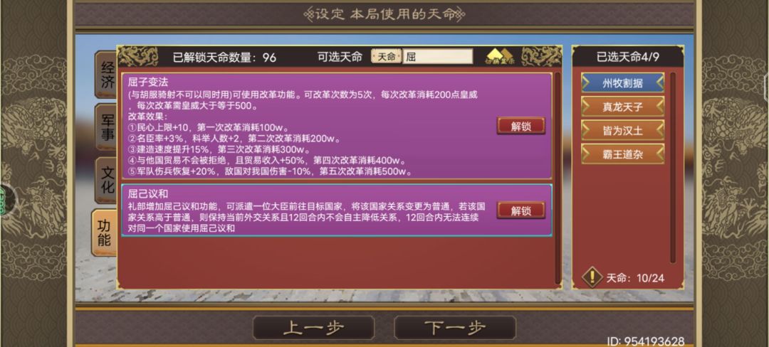 真龙天子30、皆为汉土20、霸王道杂10、心怀天下10、太平要术20、屈子变法10