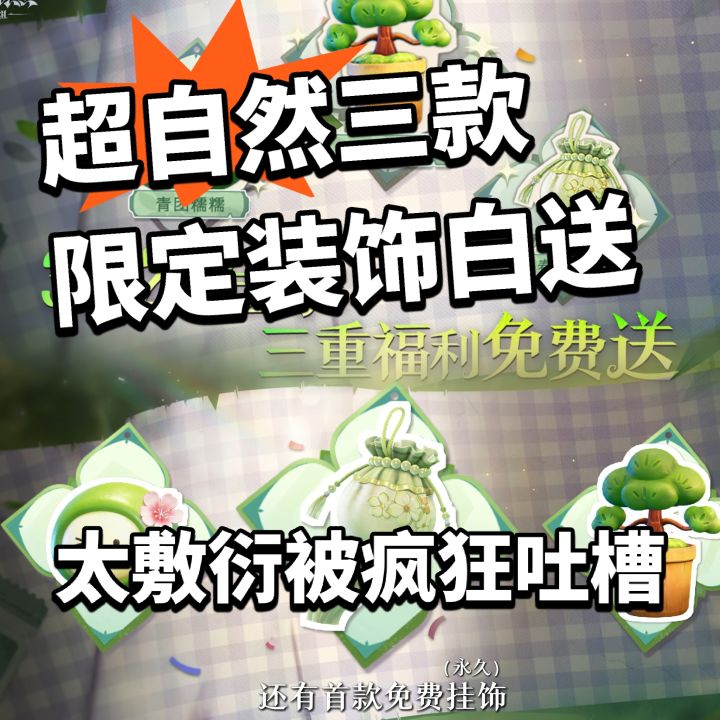 这次福利包含三款装饰,背饰“放青松”是个带笑脸的盆栽,官方玩梗“摸鱼躺平就现在”。
