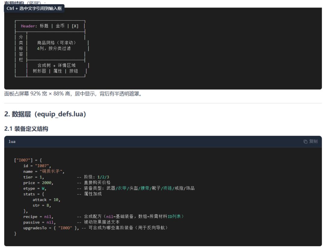 2.5 工具函数函数参数返回说明GetRecipeCost(equipId)装备IDnumber递归计算合成总价(所有基础材料价格之和)CanCraft(equipId, ownedItems)装备ID, 背包物品数组boolean检查背包中是否有足够的配方材料