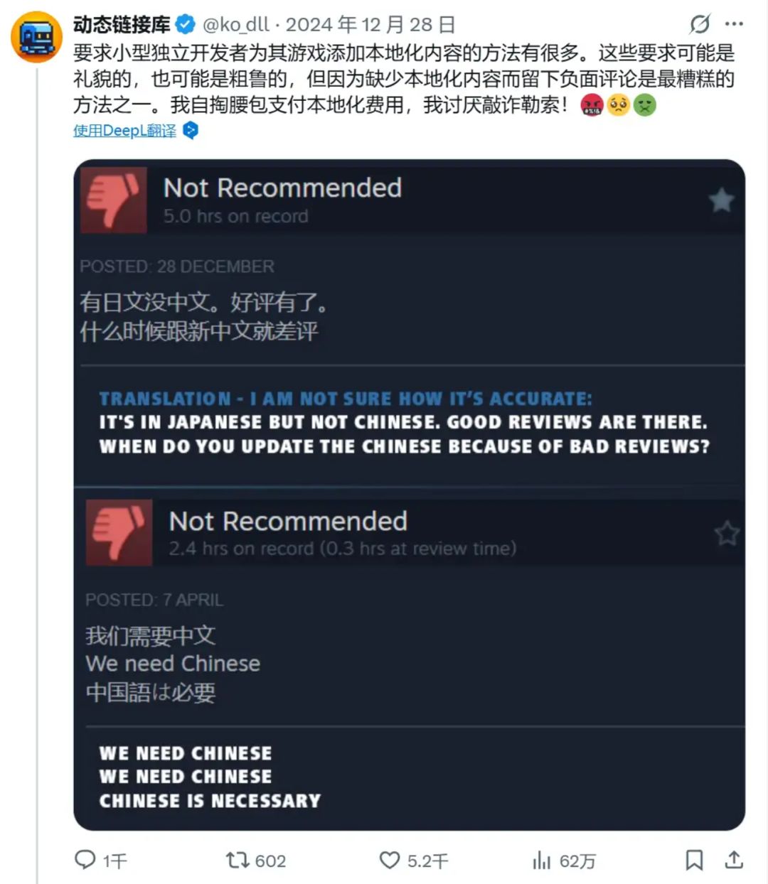 虽然在雪花般的差评下,这位老哥光速滑跪并承诺增加中文,