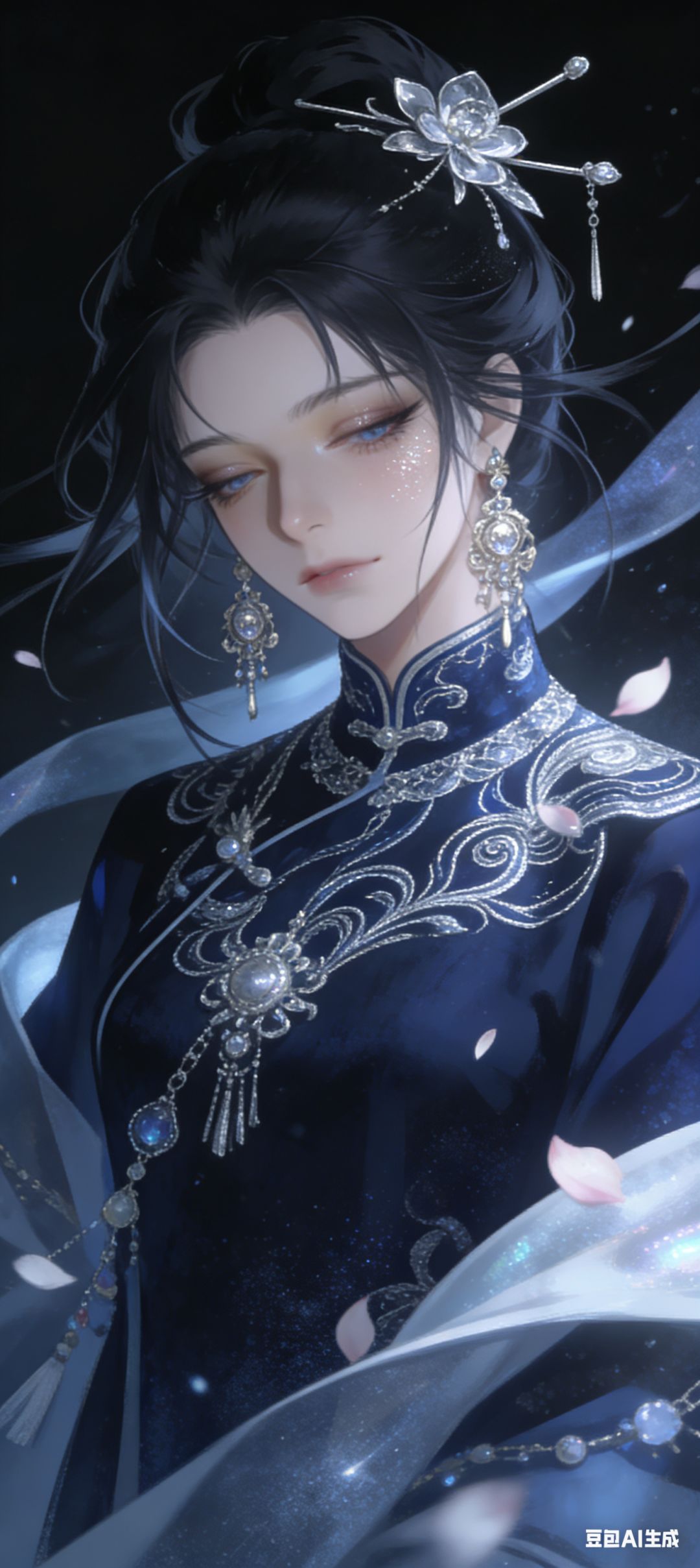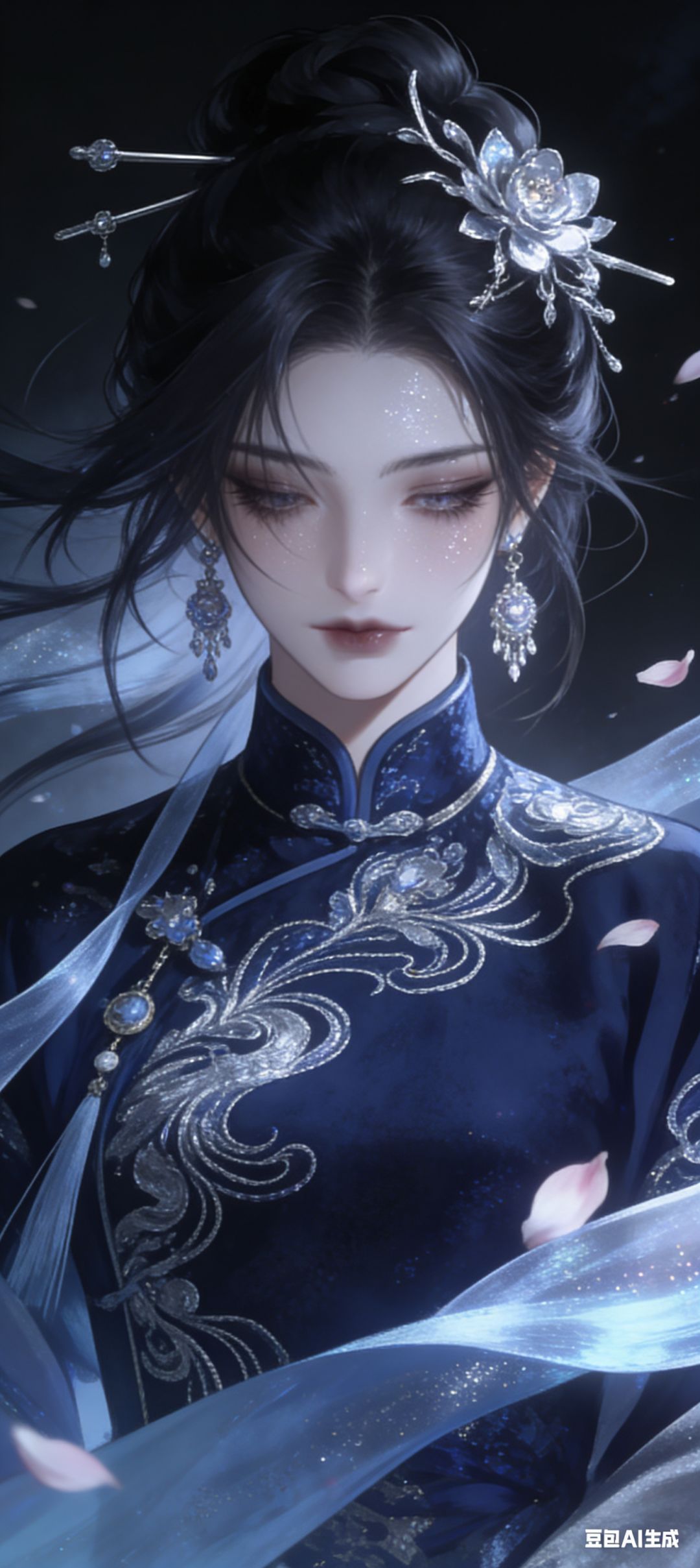 动漫风格,妖冶少女冷白皮肤,冷峻,冷酷,忧郁,高冷,高岭之花,颗粒感,丹凤眼,垂眸,慵懒,极致细节,极致厚涂,琉璃质感,流线笔刷,柔光,梦幻,朦胧,低饱和度,头部局部特写,一个美丽少女,长及腰间,璀璨眼睛。她的头发是散乱盘发的造型,眼神忧郁,眼尾微垂,长睫毛和面部细节刻画入微,脸上还带着细闪粉。她穿着一件墨蓝色色银线刺绣的中式服装,雍容华贵,头戴银簪、银花,佩戴着贵重耳饰。多装饰品。以竖版构图,在暗色背景下,狂风吹来,发丝、衣角、饰品、花瓣纷纷飞舞,展现出强烈的光影感和独特的凌乱美,突出其正面半身立绘的形象。原比例。