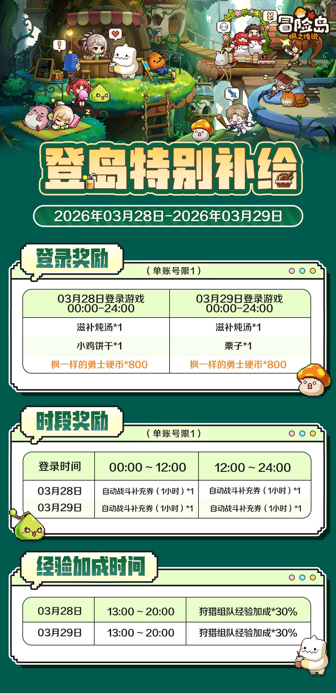 3月28日 00:00~24:00 登录游戏:滋补炖汤*1、小鸡饼干*1、枫一样的勇士硬币*800