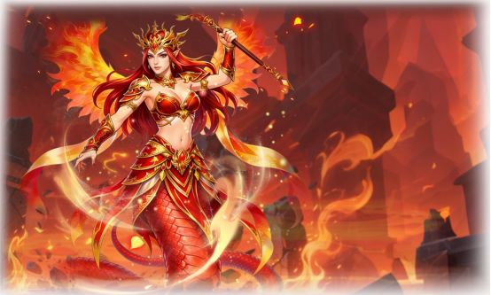「绯鳞妖后」以火焰为伴,红发如烈焰翻涌,身后火焰似凤凰羽翼,下身是覆着红鳞的蛇尾,金红战甲衬得身姿飒爽,兼具创世的慈悲与护世的威严,补天的神力仿佛透过火焰倾泻,守护着世间安宁。