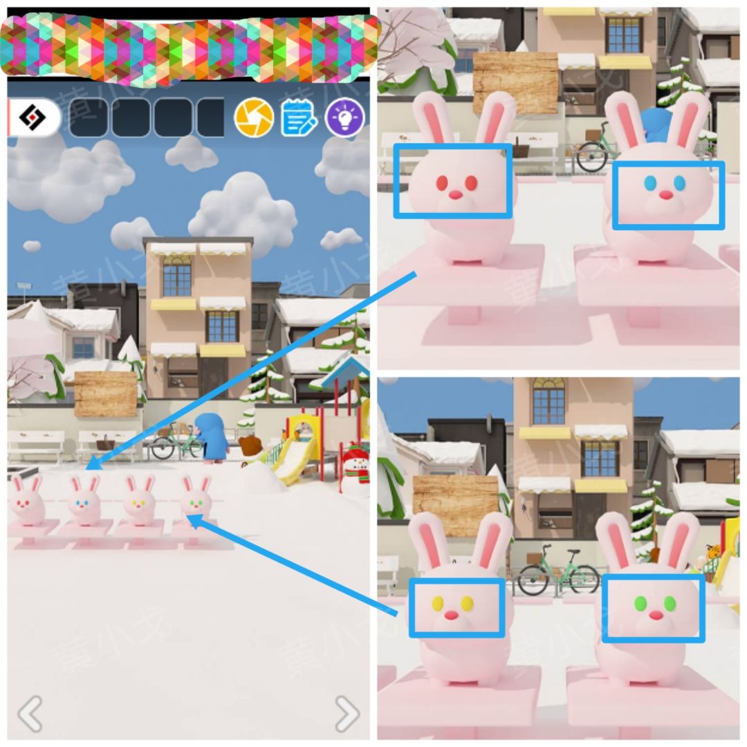 31.根据[滑滑梯]场景兔子游乐设施的眼睛颜色线索,调整对应兔子饰品的位置;打开匣子,获得【鸟食】