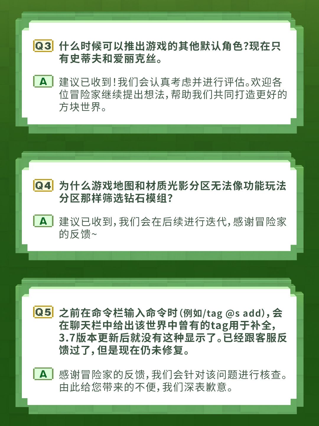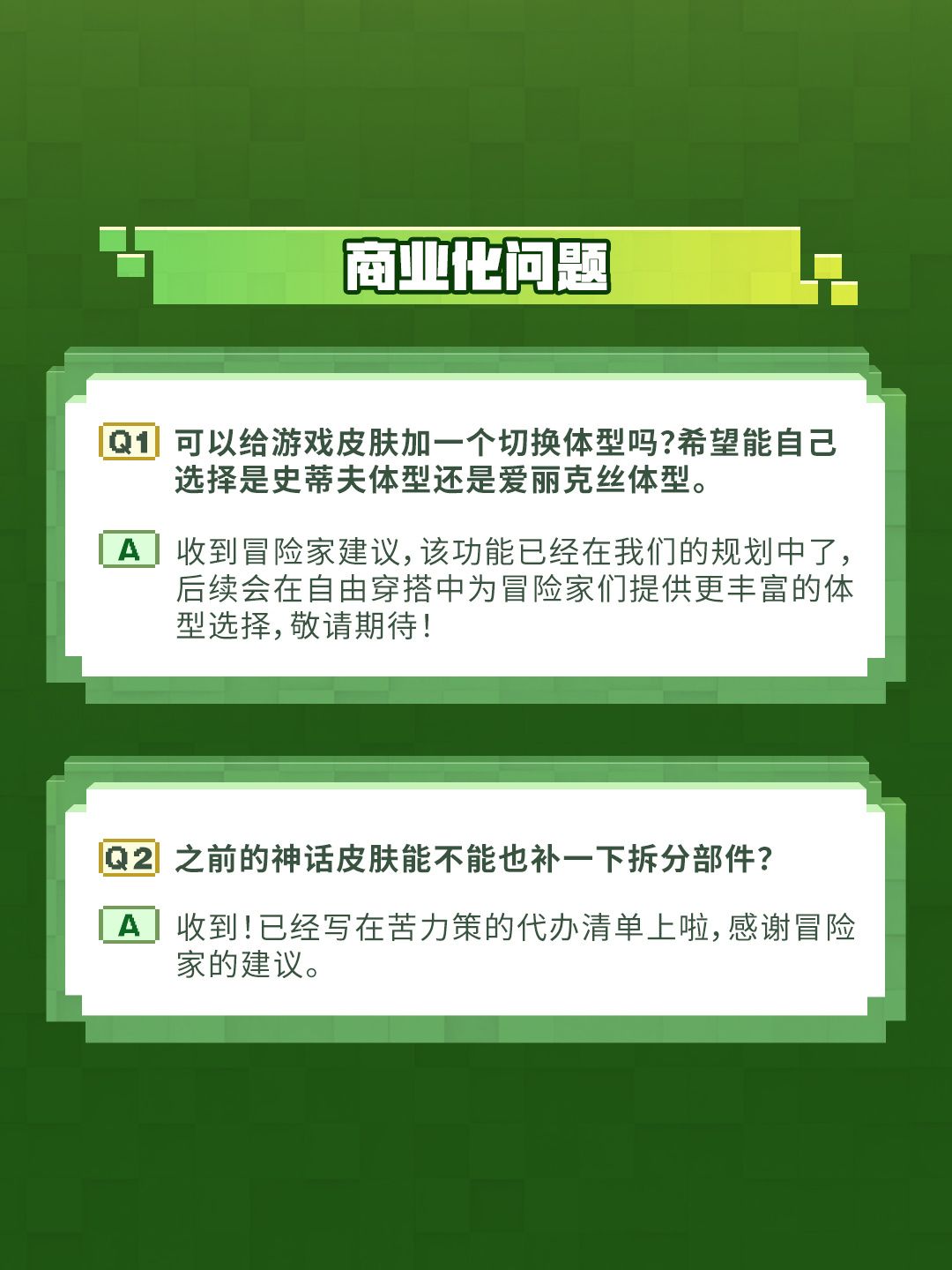 我的世界方块优化月特别版3月第三期策划事务所QA正式公开,针对玩家近期关心的体验问题、版本更新和商业化需求给出了明确答复。