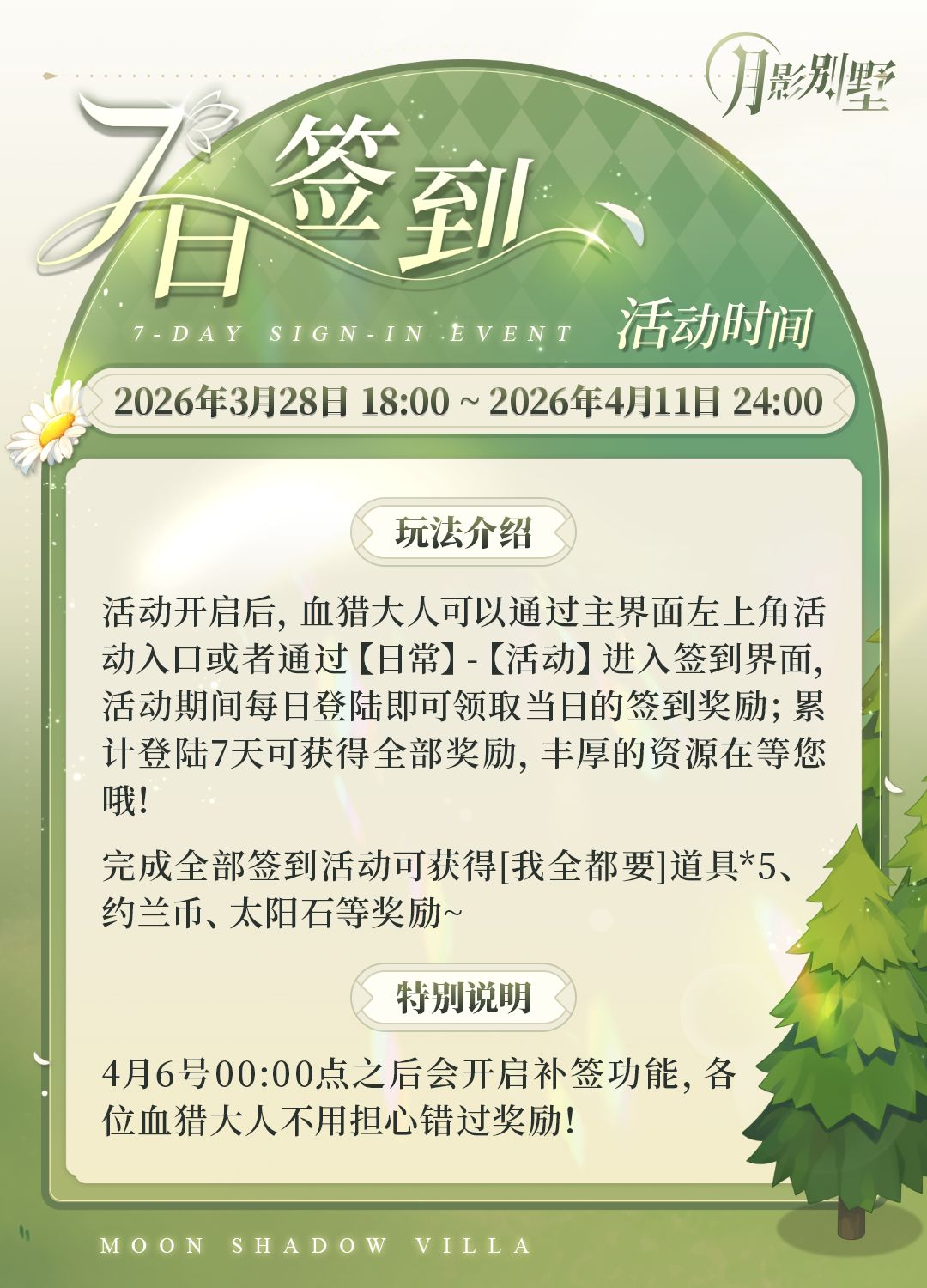 限时签到活动来袭!完成全部签到活动即可获得[我全都要]道具、约兰币、太阳石等奖励,详细内容大人请点击图片查看~