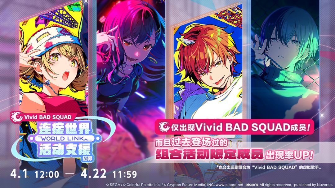 本次招募面向将于4/8举办的[Vivid BAD SQUAD]连接世界活动,仅会出现"Vivid BAD SQUAD"成员(也包含副组合为"Vivid BAD SQUAD"的成员),且过去登场过的[Vivid BAD SQUAD]组合活动限定成员的出现率比同等稀有度的其他成员更高。