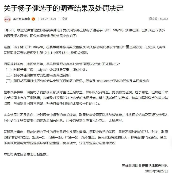 3月27日,滔搏电子竞技俱乐部(TES)发布官方公告,针对旗下英雄联盟分部打野选手杨子健(ID:naiyou)存在违反赛事公平性行为的违规事件,作出严厉处罚决定,彰显俱乐部对假赛、违规操控比赛等行为的绝对零容忍态度。