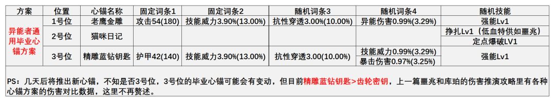在本次伤害推演过程中,奈伊、库珀和噩兆的心锚如下(3号位词条4的技能威力和暴击伤害的提升相差不大,统一使用技能威力推演方便比较)。
