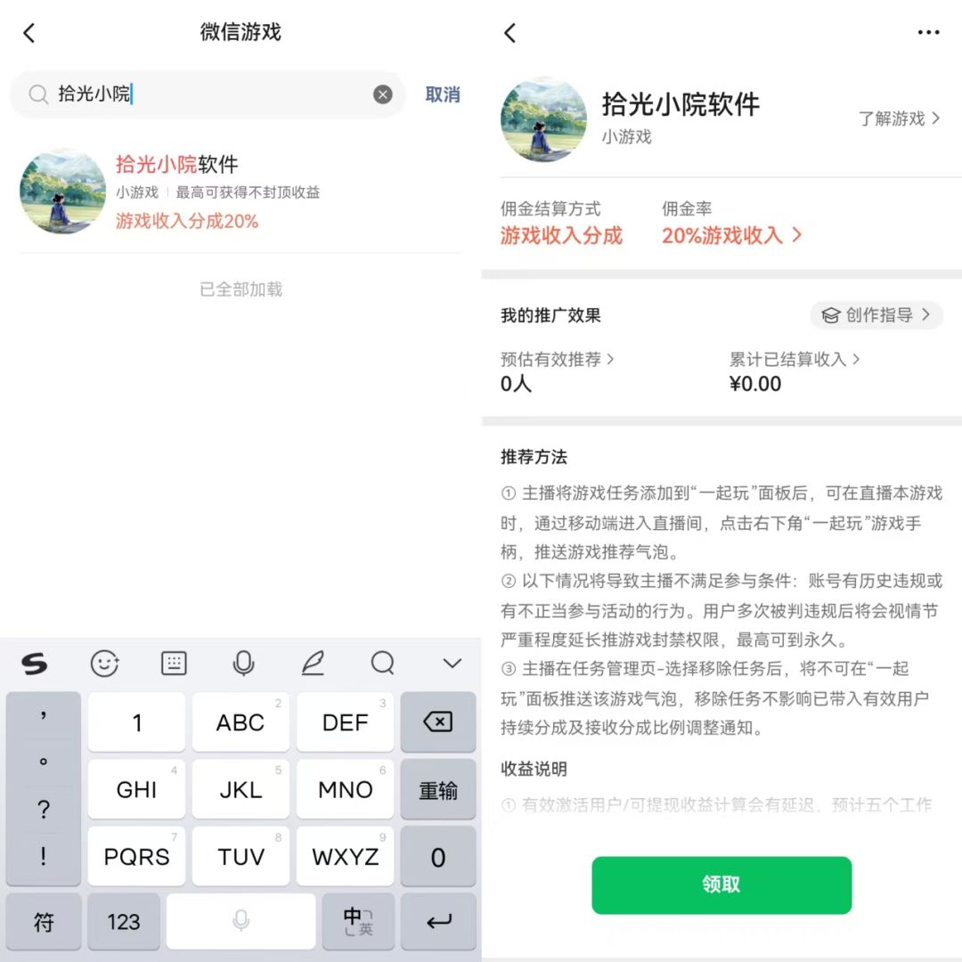 进入自己的视频号——创作者中心——创作者服务——直播游戏任务,搜索【拾光小院】,领取直播任务即可。