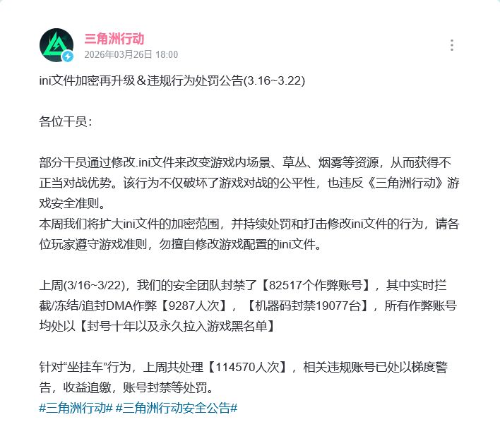 🔒三角洲行动出现修改ini文件作弊行为,官方出重拳一周封禁超8万作弊账号