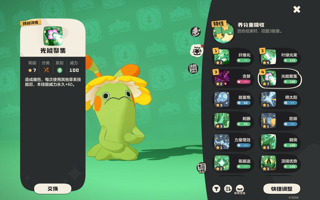 奇丽花需要改为恶系血脉,用任意血脉秘药加10个恶系碎晶能在炼金锅置换,改恶系血脉可以学贪婪,能够增加吸血,加上天赋的回能直接成永动机了。然后需要一个技能石,光能聚集,光能聚集可以抓大蒲公英,释放3次可以完成课题研究,给一个技能石还有制造书。光能聚集可以通过释放其他草系技能来不断叠加增伤,配合吸血回能直接小无敌。