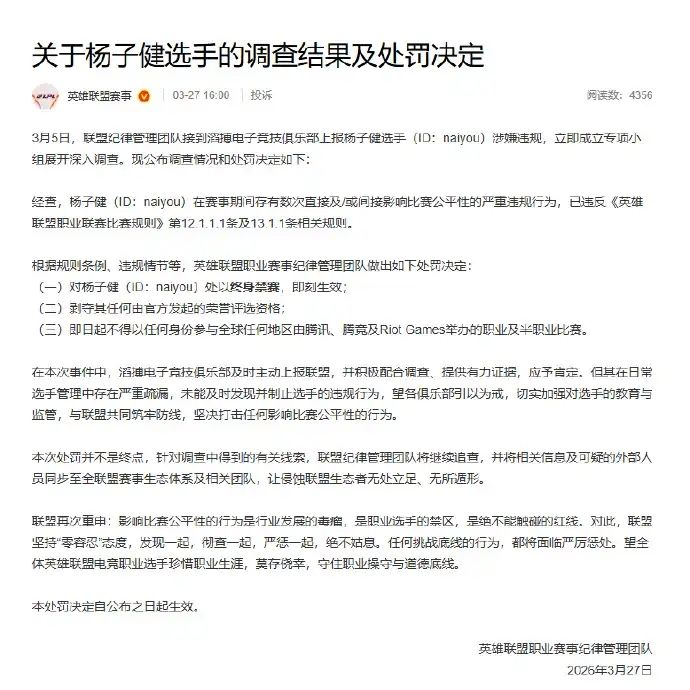 方3月27日发布公告,滔搏电子竞技俱乐部打野选手杨子健(ID:naiyou)在赛事期间存有数次直接及间接影响比赛公平性的严重违规行为,被处以终身禁赛,即刻生效