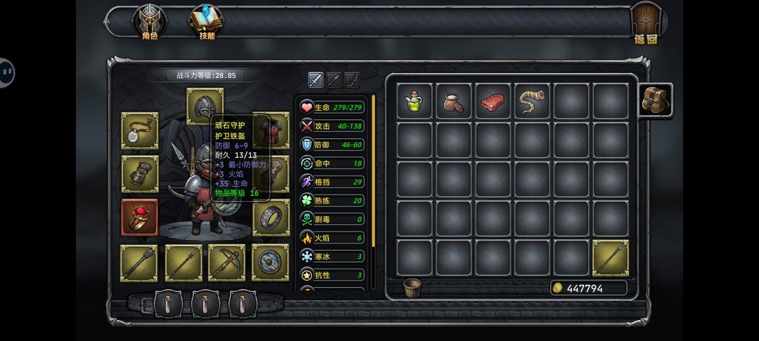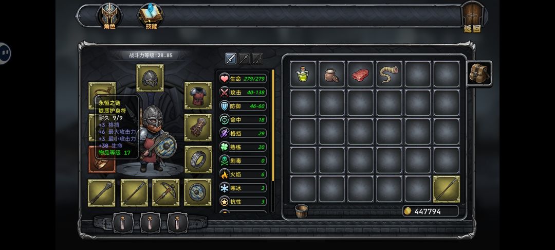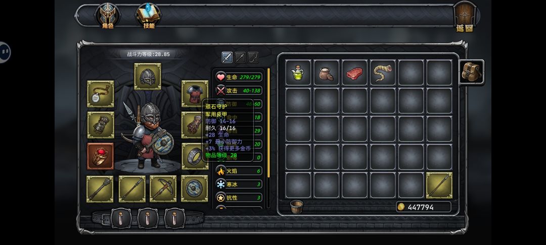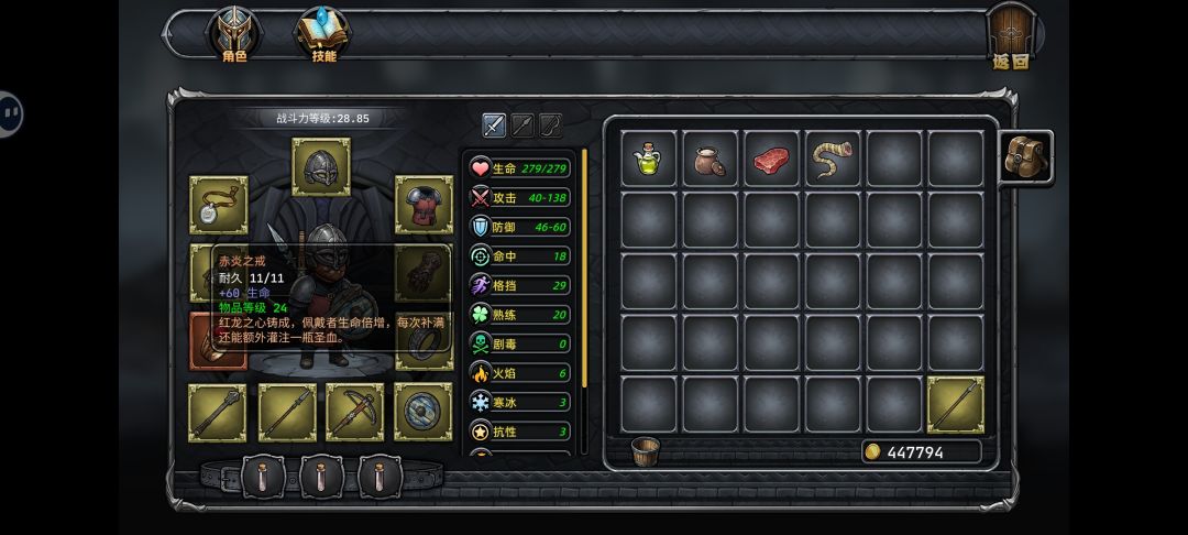 2.然后就是以我目前通关哥布林王二十几次的经验,好像橙装(上面图中那个戒指就是橙装)只有首次通关才会掉一个,而且是随机的(可能是戒指可能是项链啥的,装备属性和附带的技能也不一样),我这件是加生命然后营地一次能装两瓶血的,打BOSS挺好用的,如果觉得掉的橙装不行的话只能刷档重开了,毕竟只能刷出一件橙装来,很重要。
