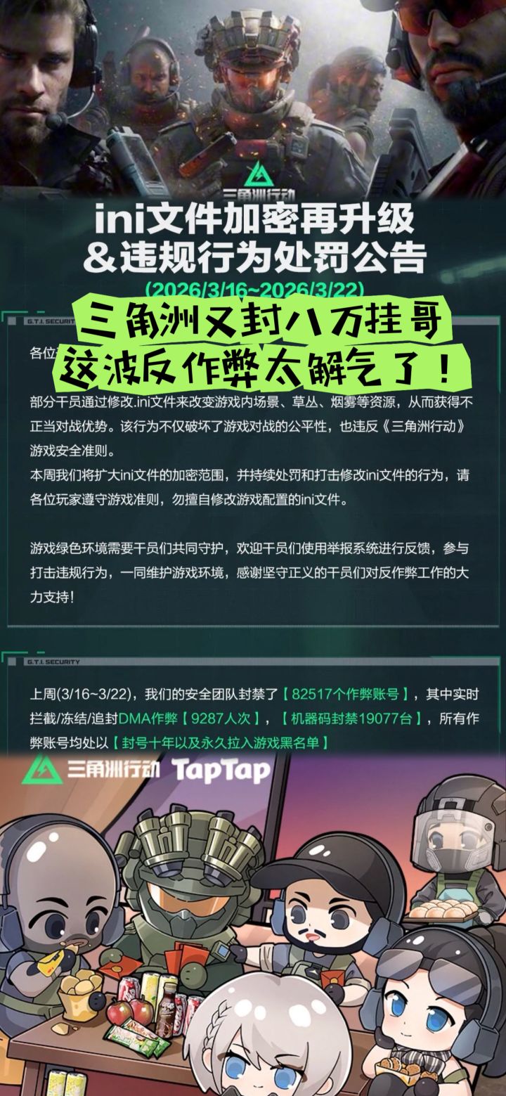 近期《三角洲行动》作弊手段再度升级,不少玩家利用修改文件的方式破坏对局公平,官方也迅速祭出强力反作弊措施。作为腾讯天美工作室打造的硬核战术射击游戏,三角洲在3月26日正式发布安全公告,对玩家反映强烈的篡改ini配置文件作弊行为进行专项整治,通过扩大ini文件加密范围,从根源上遏制这类通过修改场景、植被、烟雾效果来获取不正当优势的违规行为。