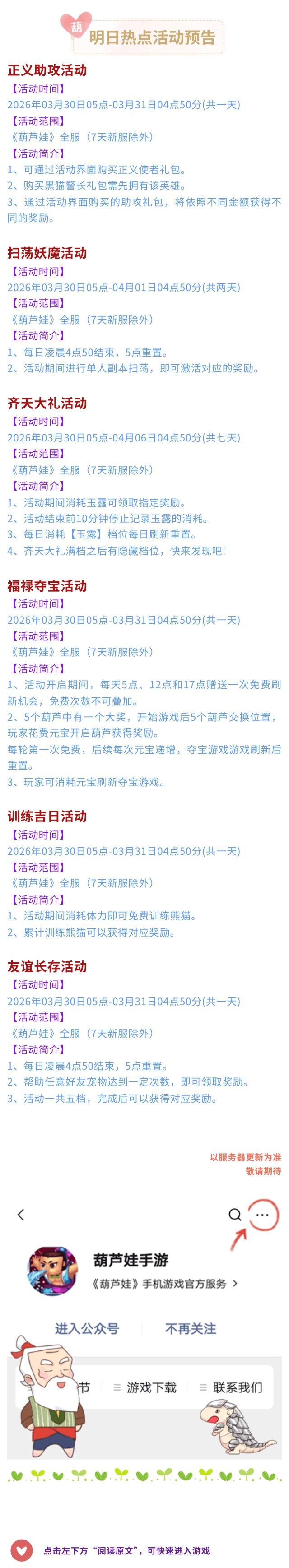 【葫芦娃】3月30日活动预告