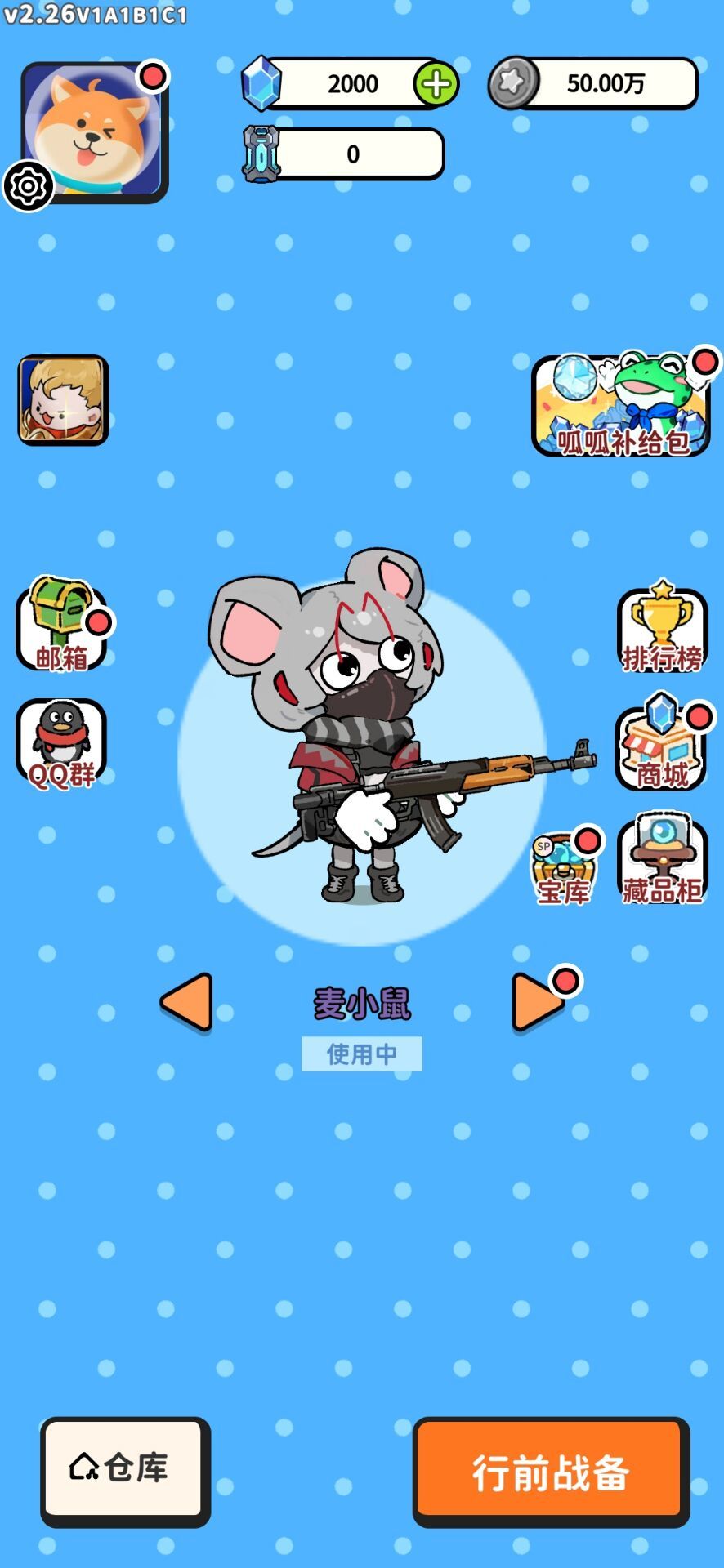 1.进游戏为该界面 先将能领取的福利全部领取 重要的一点是呱呱补给包 新手看广告领取呱呱皮肤和游戏货币