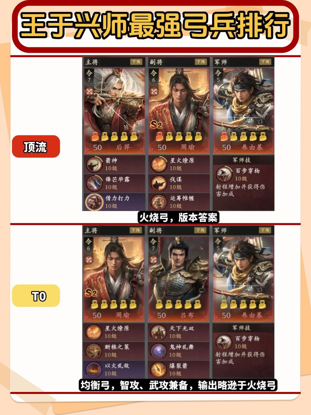 目前最强的弓兵还是后羿周瑜的火烧弓,然后是周瑜吕布的均衡弓,伤害略逊些