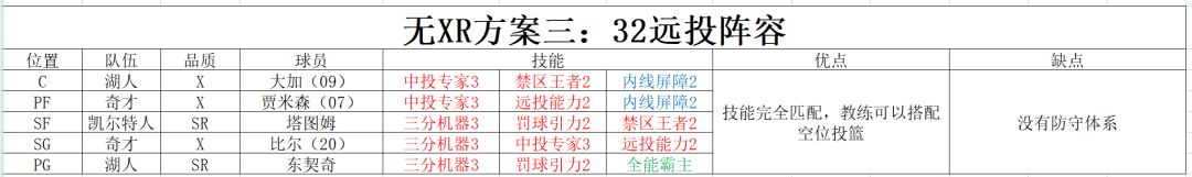 32远投阵容用的人相对较少,把3 2 罚球引力 禁区王者 远投能力这些配满占据技能位相当多。阵容并不主流,但是如果教练刷出了雷迪克的空位投篮技能,那么这个阵容搭配教练技能非常合适。这个阵容和传统32造犯规阵容一样,进攻流畅、造犯规猛、适合搭配造犯规特技打快节奏。