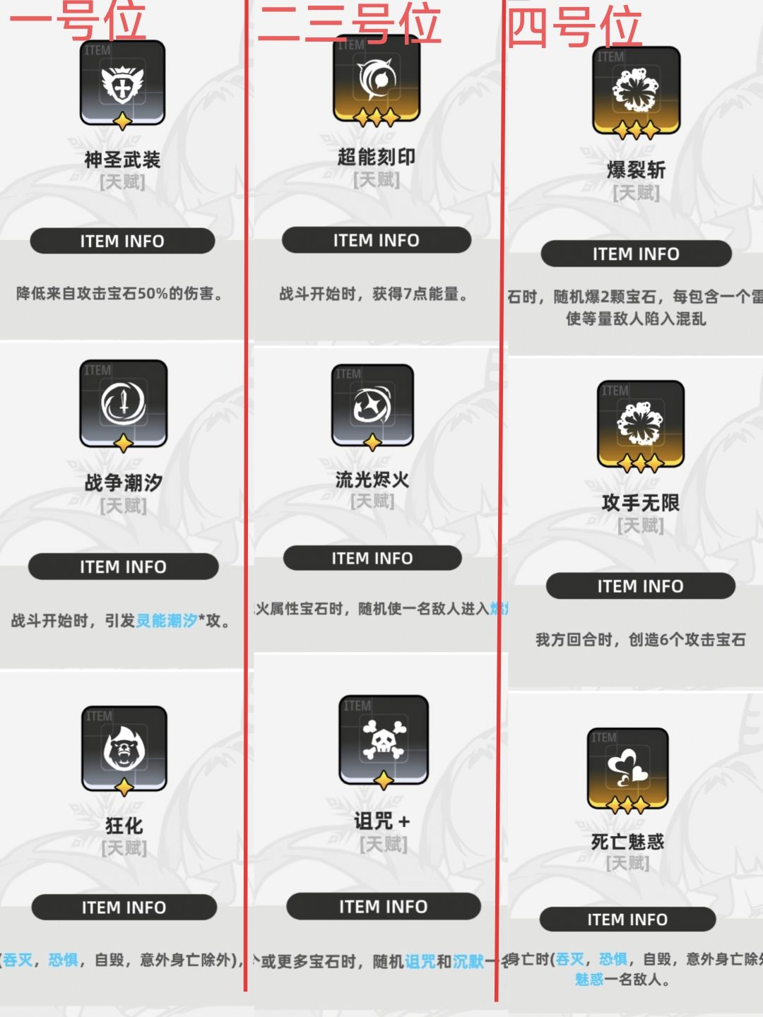 一二三号位天赋除诅咒外都是商店出现频率高且实用的天赋。一号位天赋能早些准备上就早些,到第一个关键点时坦度和攻击都更高,降低翻车率。二三号位后面可以赌灵包,天赋主要前期过渡用,流光和刻印都是前期清怪的。