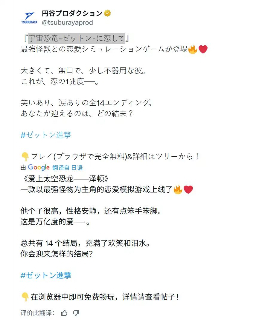 近日,奥特曼系列母公司,圆谷公司推出了一款,可以与宇宙恐龙杰顿谈恋爱的恋爱模拟游戏。