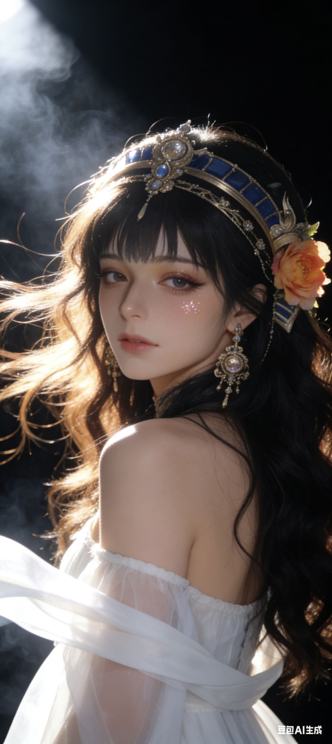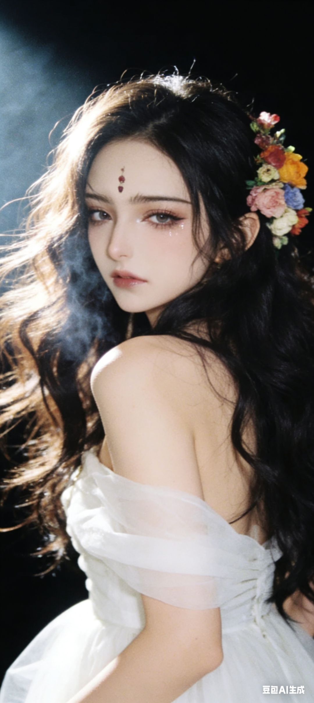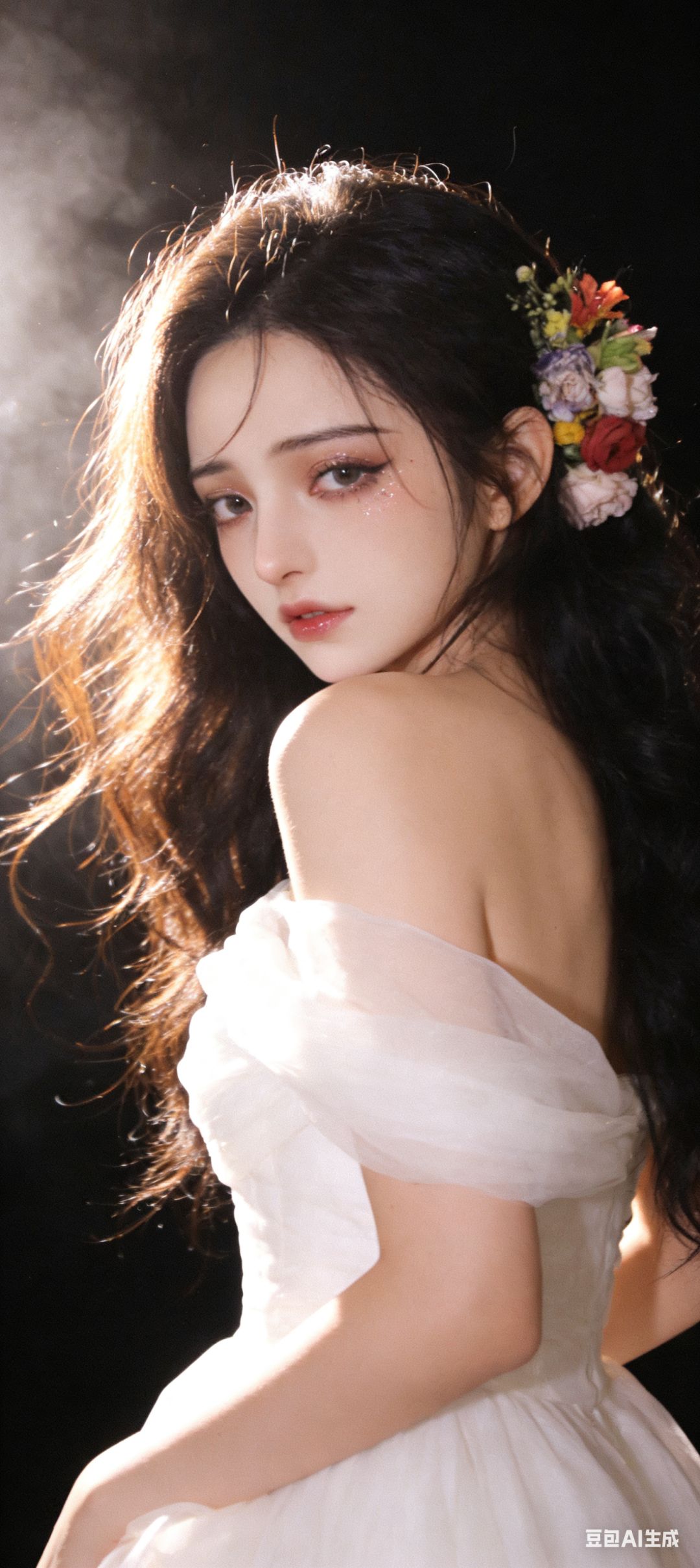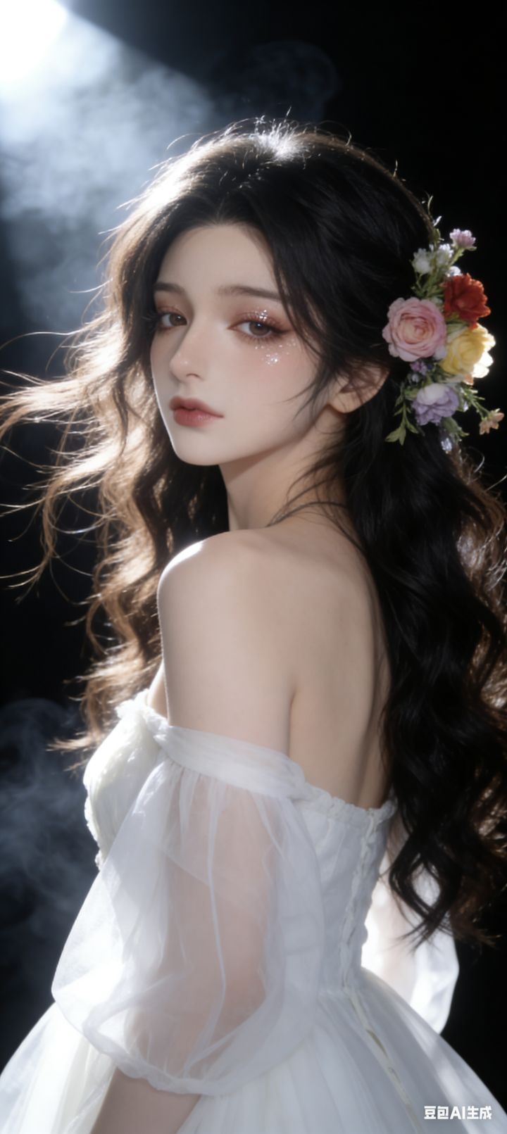 女性写真,人物动作是回头惊鸿一瞥,直视镜头,突出动人心魂的眼神,浓密的长卷发自然散落,一些发丝飞扬体现回头瞬间的动态感,逆光照亮飞扬的发丝,右耳后别着一些色彩各异的鲜花,妆容精致古典,眼妆为粉棕色并有闪粉点缀,唇妆为豆沙色,人物逆光,逆光强化人物轮廓,身穿露肩的白色纱裙,背景为黑色受到左上方光线的影响有明暗变化,高明暗对比度,抓拍,有烟雾缭绕的朦胧感,胶片质感。