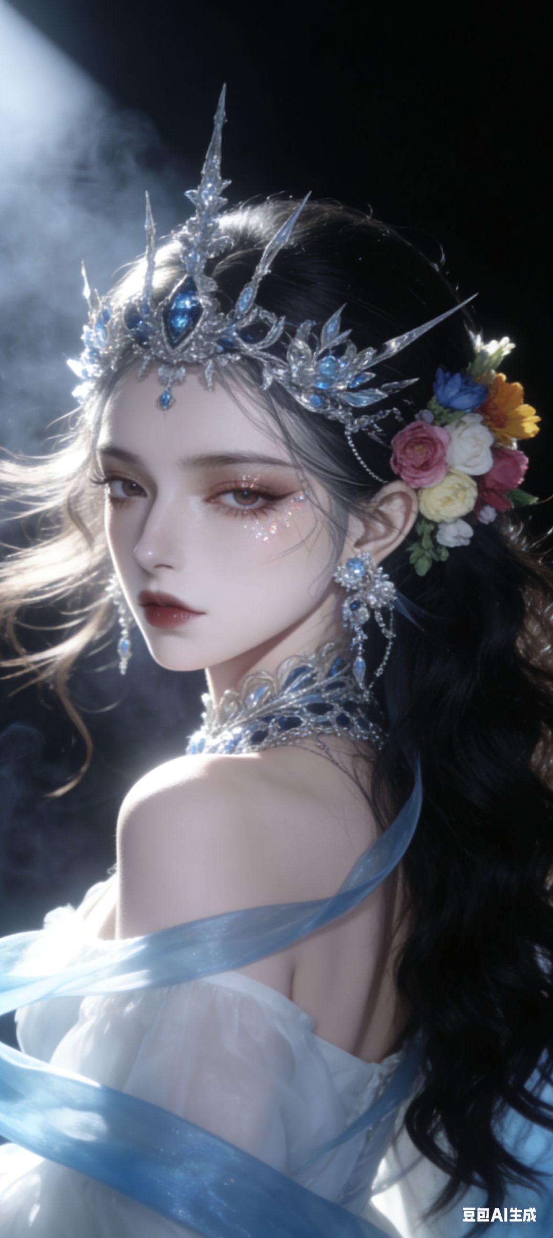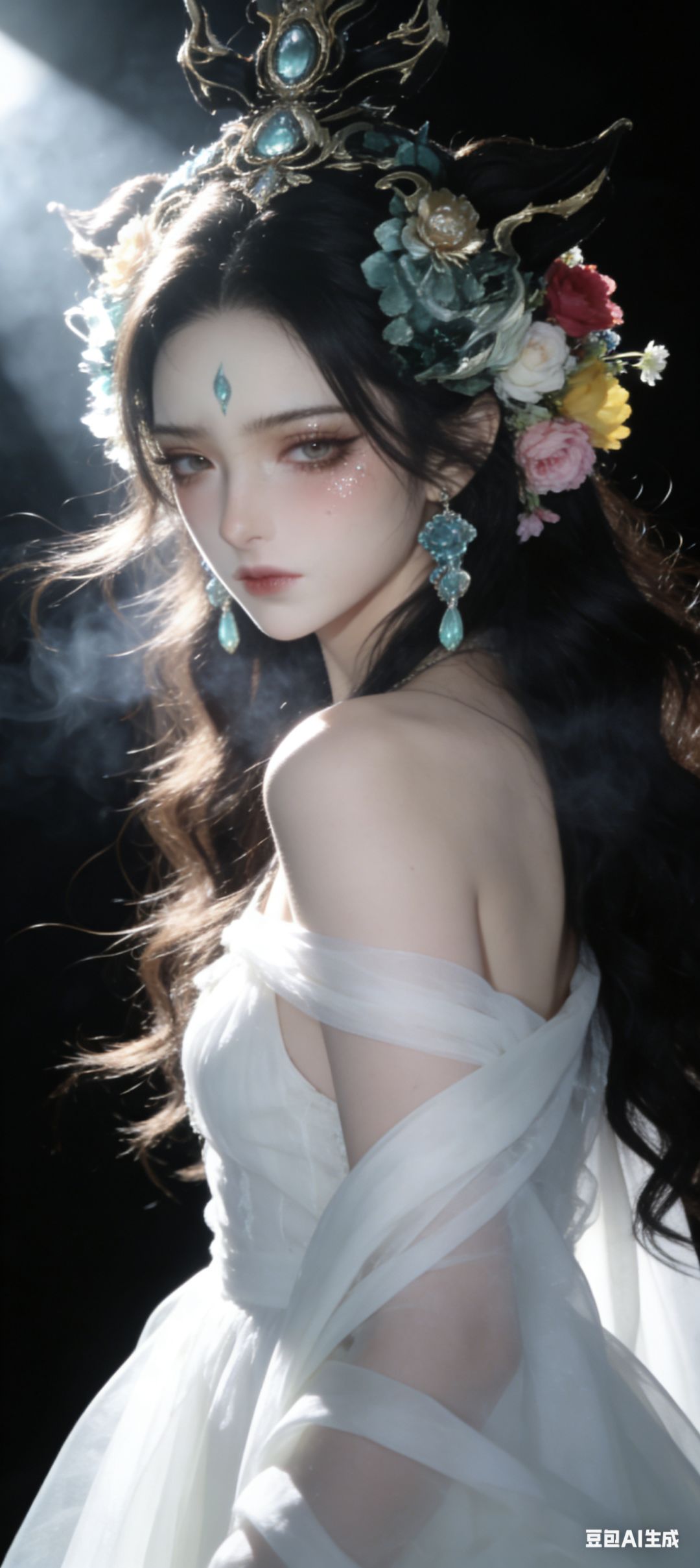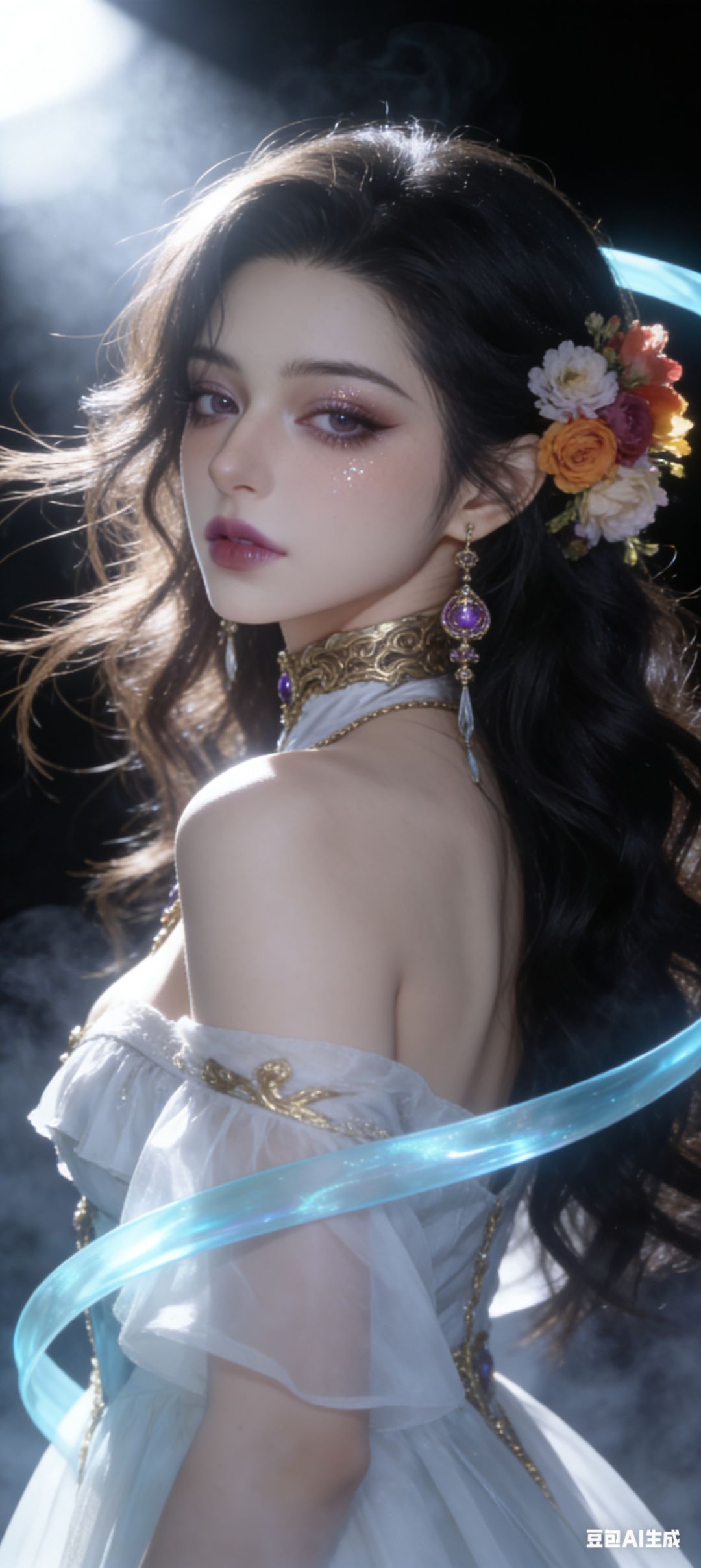 女性写真,人物动作是回头惊鸿一瞥,直视镜头,突出动人心魂的眼神,浓密的长卷发自然散落,一些发丝飞扬体现回头瞬间的动态感,逆光照亮飞扬的发丝,右耳后别着一些色彩各异的鲜花,妆容精致古典,眼妆为粉棕色并有闪粉点缀,唇妆为豆沙色,人物逆光,逆光强化人物轮廓,身穿露肩的白色纱裙,背景为黑色受到左上方光线的影响有明暗变化,高明暗对比度,抓拍,有烟雾缭绕的朦胧感,胶片质感。