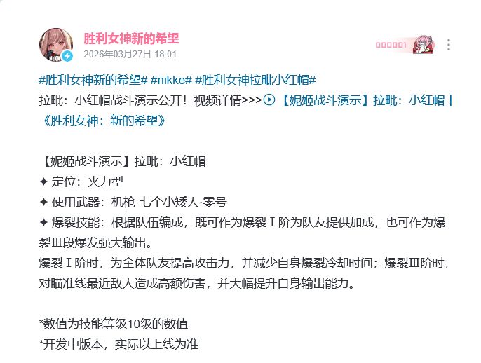 国服由腾讯游戏及咪咕快游联合发行的韩国手游《胜利女神:妮姬》(后文简称妮姬)近日爆料了新角色拉比小红帽的技能信息,家人们又有瓜吃了