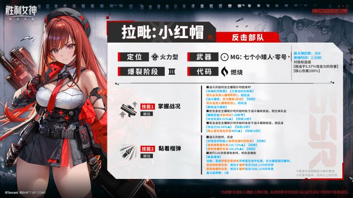 本次公开的角色定位为火力型,使用武器为机枪,其爆裂技能可根据队伍编成在一阶和三阶之间灵活切换,既能为队友提供加成也能打出高额输出